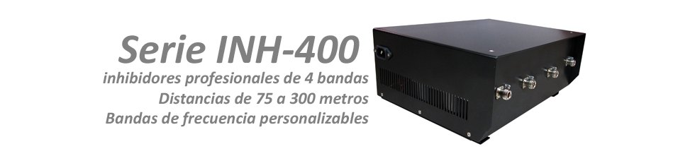 Inhibidor INH-400 para 4 bandas de frecuencia, es un equipo perfecto para inhibir comunicaciones en zonas de seguridad, en las que interesa deshabilitar las comunicaciones inalámbricas, tales como salones de juntas, embajadas, instalaciones gubernamentales, prisiones, juzgados, instituciones financieras, laboratorios de investigación, casinos, trenes, estudios de grabación, cárceles, etc., con la característica adicional de poder regular la potencia de la señal de interferencia, desde 0W hasta 50W, en el caso del modelo más potente.